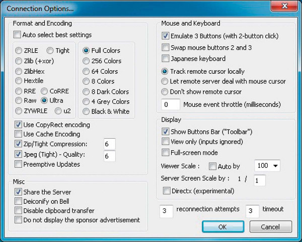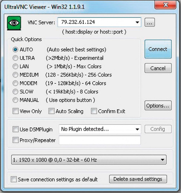 Чтобы проделать такую операцию, надо в главном меню приложения нажать на пункт Options, снять флажочек перед надписью Auto select best settings. Затем нужно выбрать предоставленный пункт Ulta, выполнить активацию такой опции, как Use CopyRectencoding, Zip/tight Compression и Jpeg — Quality. После чего остается нажать на пункт OK, на всплывшем окне следует выполнить подтверждение сохранения установленных настроек, нажав на строчку Connect.