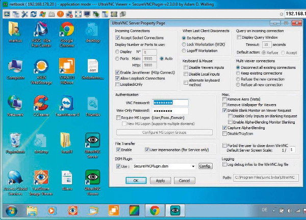 Шифрование передачи данных осуществляется с помощью вспомогательного ПО — UltraVNC. Так как сама утилита не может предложить шифрование, надо добавить эту функцию при помощи определённого плагина: